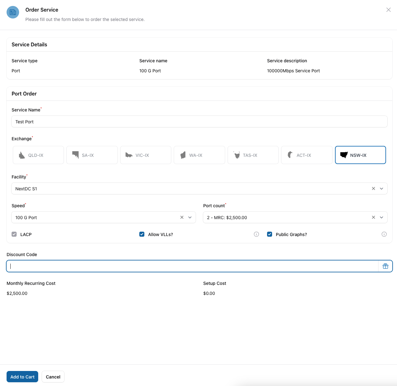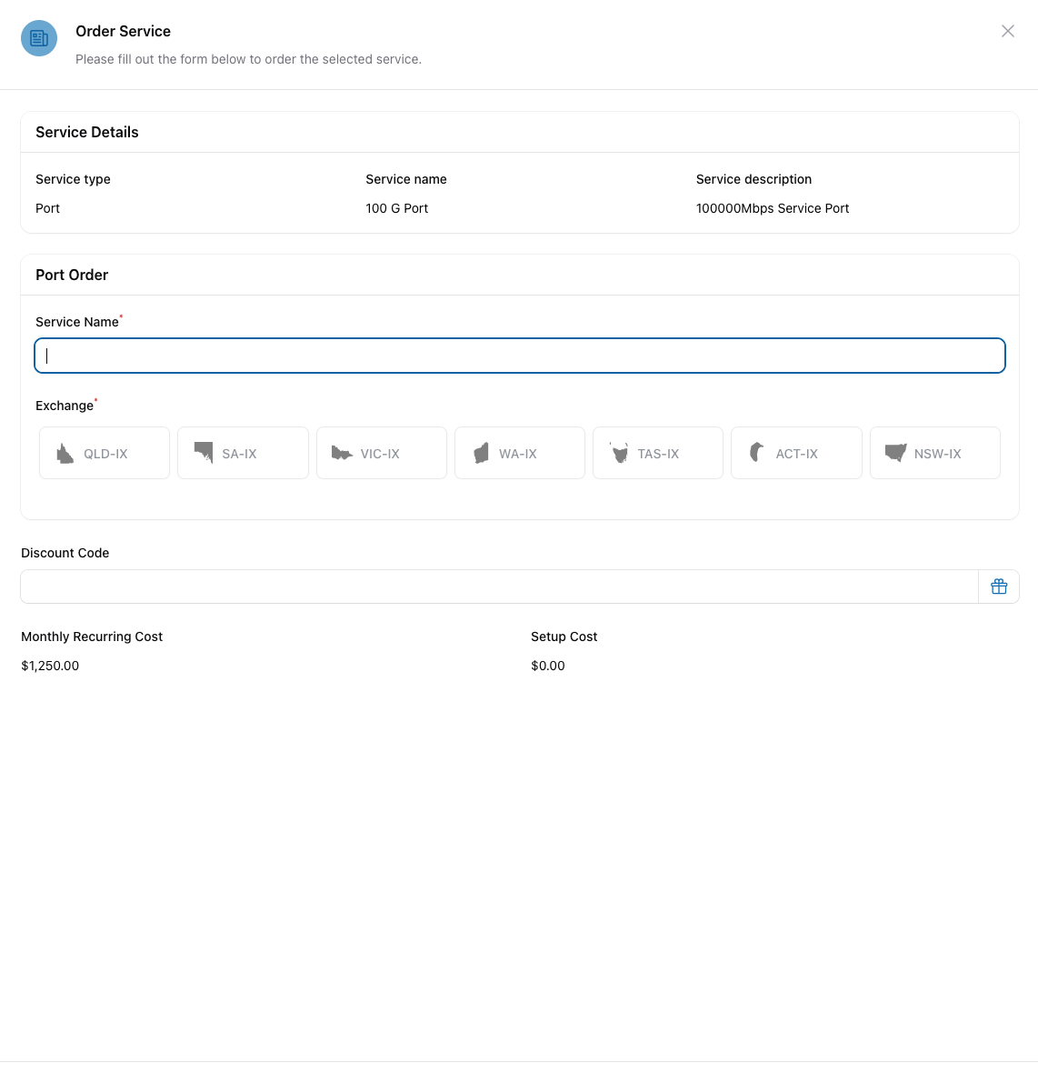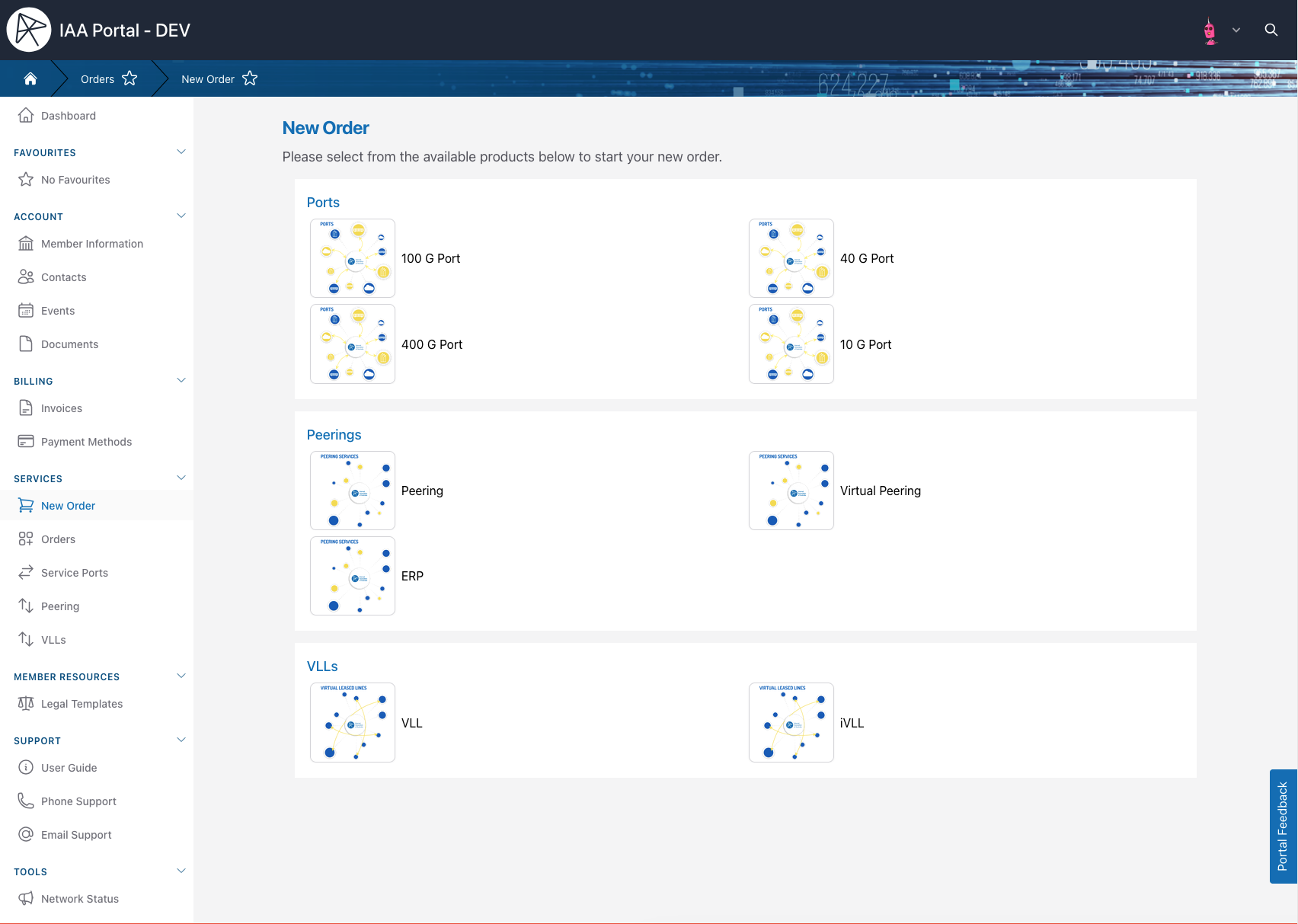 To Order a New Service select the desired product type, in this example we will order a new 100G port.